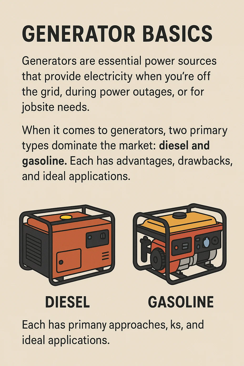 Gineadóirí díosail is eol dóibh as a n-iontaofacht, a n-éifeachtúlacht breosla, agus a saolré fada. Feidhmíonn siad mar an gcéanna le gineadóirí gásailín ach tá siad faoi thiomáint ag breosla díosail, a bhfuil a sraith uathúil féin buntáistí agus míbhuntáistí. Is gnách go n-úsáidtear gineadóirí díosail i gcásanna ina bhfuil gá le cumhacht fadtéarmach, tromshaothair, rud a fhágann go bhfuil an-tóir orthu do ghnólachtaí, do thionscadail tógála ar scála mór, agus do chónaí lasmuigh den ghreille.